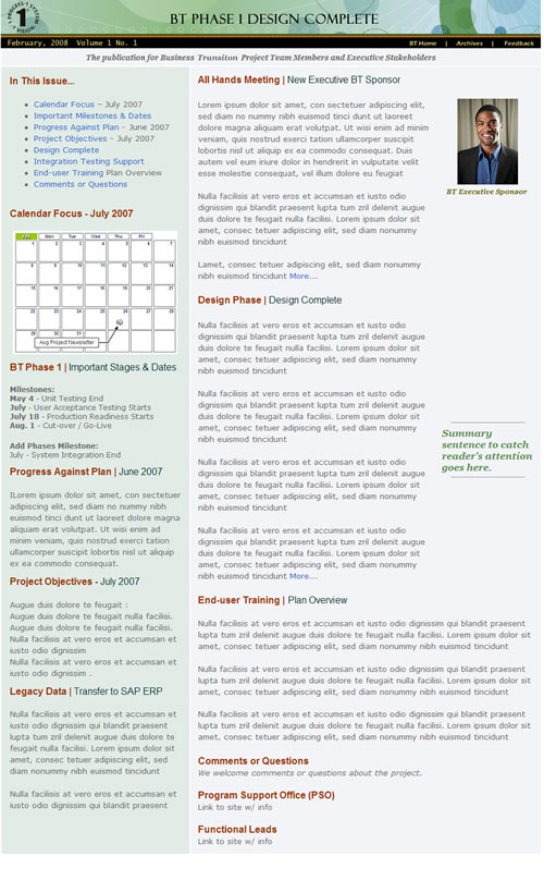 This email was designed to complement the BT Web site as another communication channel. It was sent out on a monthly basis to make sure that employees and executives were kept abreast of information they needed to know. Note: Most of the text and pictures on the site have been replaced with generic content for confidentiality purposes.