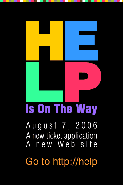 The Global Help Desk Web site was the second most used site in this corporation. The department's management wanted to make sure that replacing the old site would not come as a surprise to employees, especially the executives. The design was not intended to coordinate with the Web site's more business-like approach to graphics, but rather to make sure employees noticed it among other material on building bulletin boards. These posters were distributed throughout the campuses weeks before the new site and application were launched.