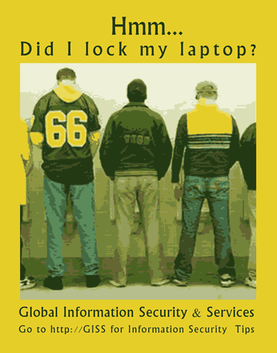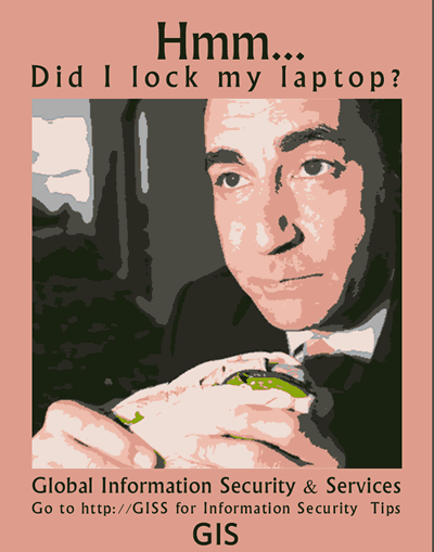 Another humorous poster. The concept is to portray the typical situations where a laptop is not bothered to be locked down because the time away is brief - like a coffee or bathroom break. This concept was mostly to entertain the security manager with no real intent of distributing it since it could be offensive to some global cultures.